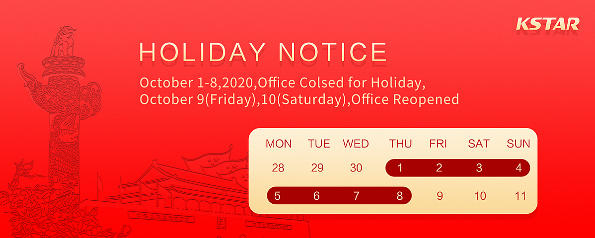 To celebrate the National Day of the People's Republic of China, our office will be closed from October 1st (Thursday to 8th (Thursday), 2020. We will come back to work on 9th October.