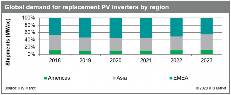 According to IHS Markit, the greatest need for inverter replacements lies in Germany, Italy and Spain, which together accounted for over 70% of replacement demand in the EMEA region.